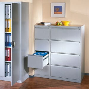 Szafki metalowe na klucz wykonane są z wysokogatunkowej stali, która gwarantuje stabilność, wytrzymałość i długowieczność w każdych warunkach. Stalowa konstrukcja chroni przed uszkodzeniami mechanicznymi, wilgocią i intensywną eksploatacją, dlatego meble te sprawdzają się w halach produkcyjnych, warsztatach, magazynach i szatniach. Metalowe powierzchnie są łatwe w utrzymaniu czystości. Wystarczy przetrzeć je wilgotną szmatką, aby przywrócić estetyczny wygląd. To szczególnie istotne w placówkach medycznych, obiektach sportowych czy biurach, gdzie wymagania higieniczne są wysokie. Solidne zawiasy i wzmocnione drzwi zapewniają bezawaryjne działanie nawet po latach codziennego użytkowania. Antykorozyjne powłoki chronią przed rdzą i zachowują estetykę mebla przez długi czas. Modułowa budowa pozwala na łączenie szafek w zestawy i dopasowanie układu do wymiarów pomieszczenia. Nasze meble metalowe łączą funkcjonalność z estetyką i tworzą uporządkowaną przestrzeń w każdym wnętrzu.